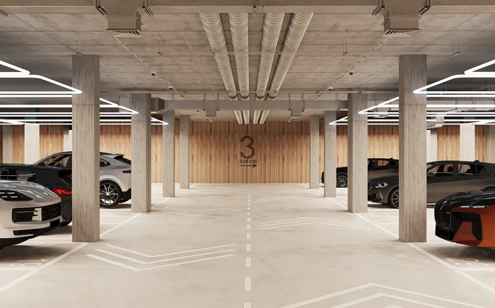 В отделке паркинга мы используем панели с текстурой дерева и бетон, выполнится разметка, навигация и линейное освещение.