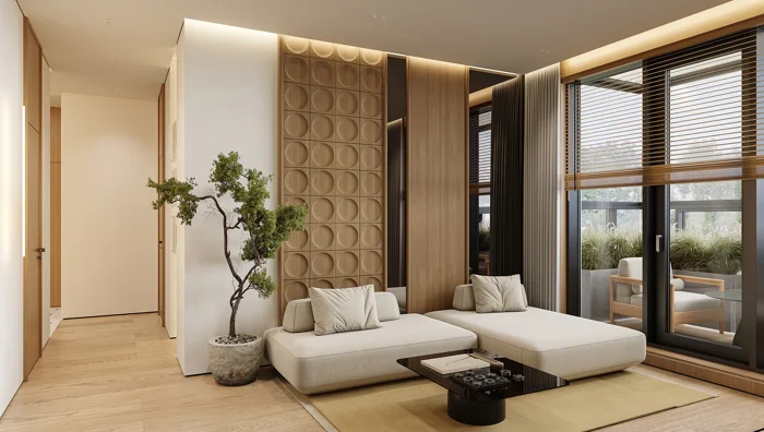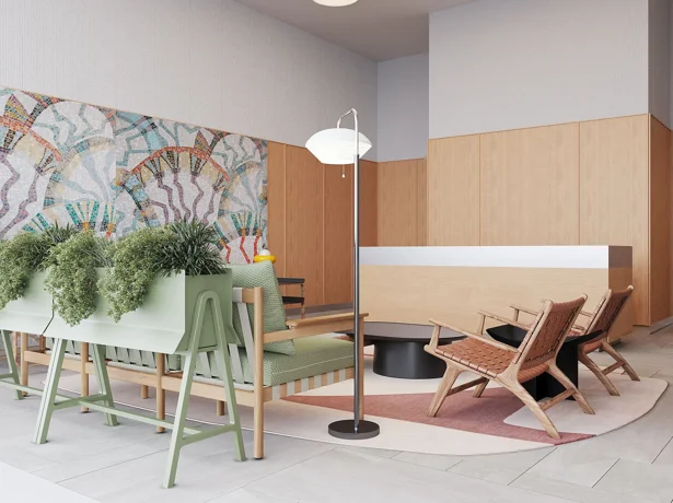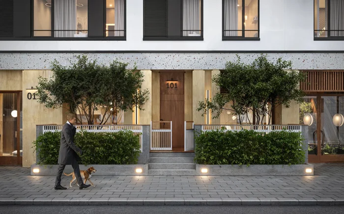 Лобби разделены на два типа — большие (одно на каждый дом) и компактные (на каждую секцию). Но принципы остались едиными. Для создания интерьеров лобби и холлов используются материалы природных оттенков, текстуры дерева и камня, матовые поверхности. В большие открытые пространства запускается много естественного света, а витражное остекление органично связывает помещения с ландшафтом.