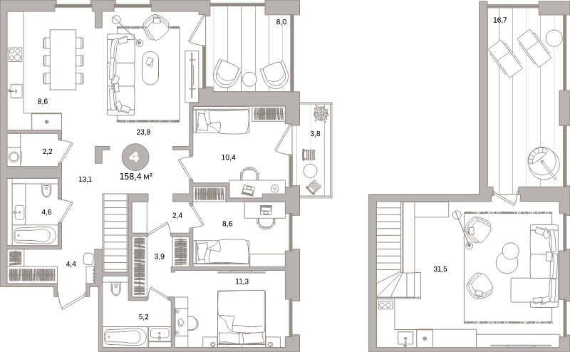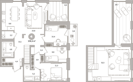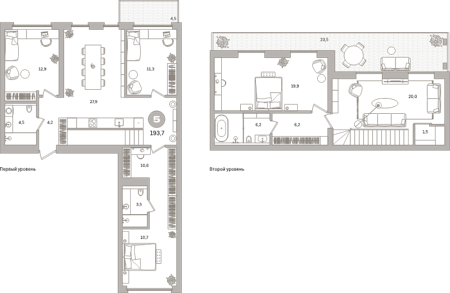 Таунхаусы — одна из главных фишек проекта. Это пять трехуровневых квартир с индивидуальным входом и собственным гаражом с доступом в паркинг. У каждого таунхауса две террасы — на кровле и во дворе. Впечатляющие площади — каждая такая квартира около двухсот квадратных метров. Вид из окон — на внутренний кольцевой променад.