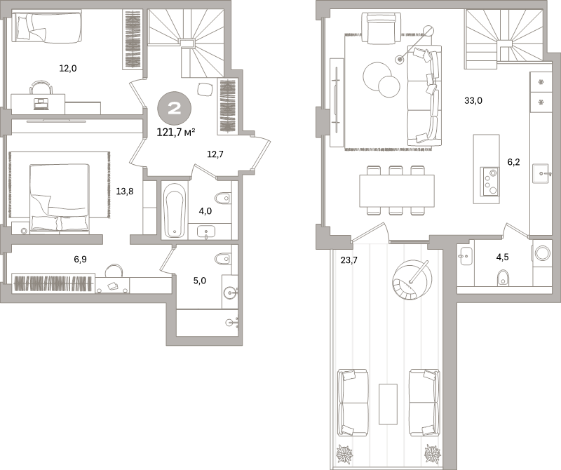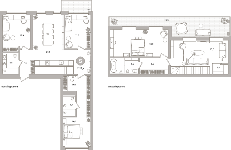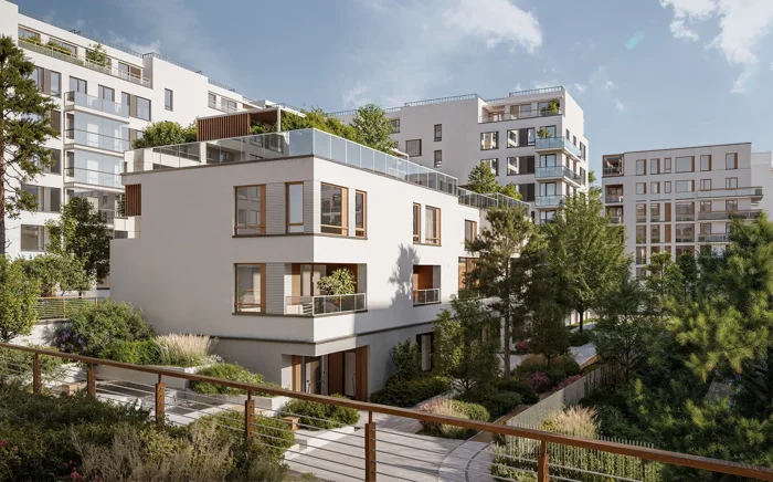 Двухуровневые квартиры на первых этажах, расположенные со стороны парка, имеют собственный палисадник с густой цветущей зеленью и входную группу с калиткой. Кроме этого, в таких квартирах есть террасы с выходом во двор, богатым зеленым буфером и навесом.