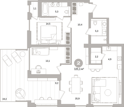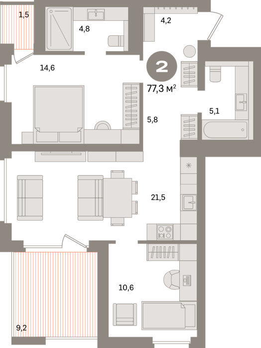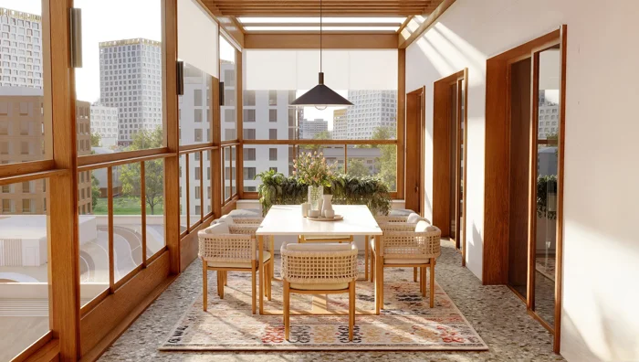 Здесь много лотов с панорамными окнами в пол и летними помещениями. На верхних этажах урбан-вилл террасы особенных квартир защищены от ветра и осадков витражным остеклением — это так называемые веранды, которыми вы сможете пользоваться круглый год.