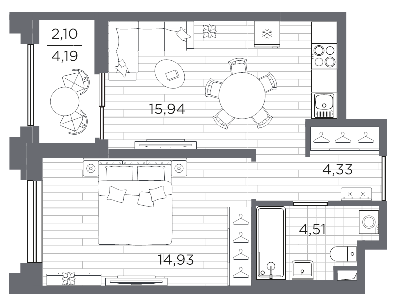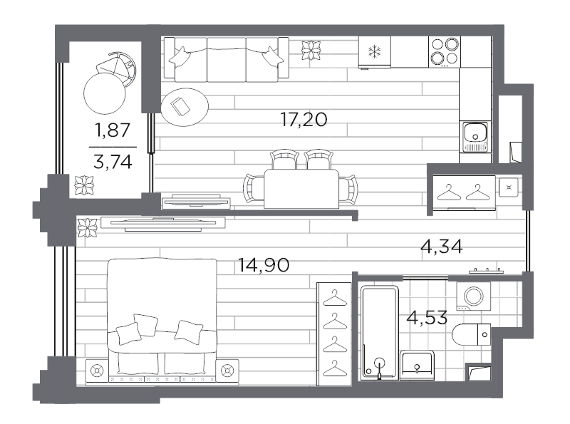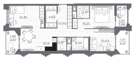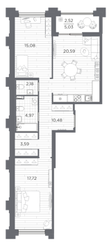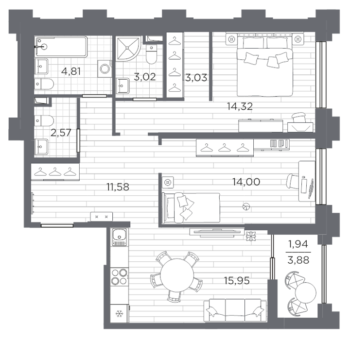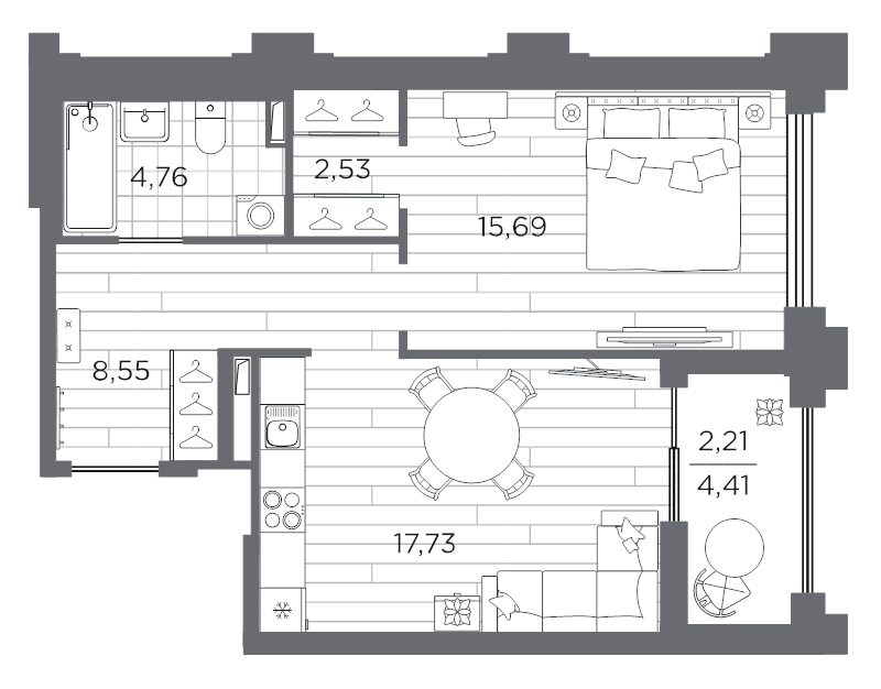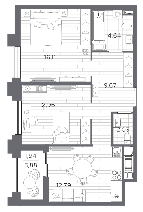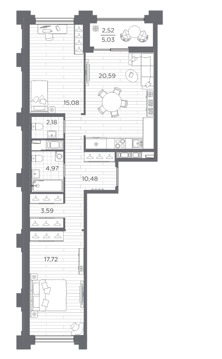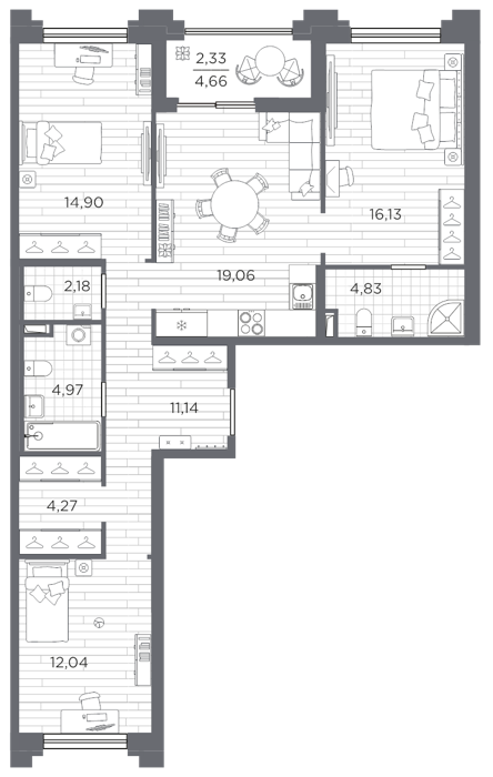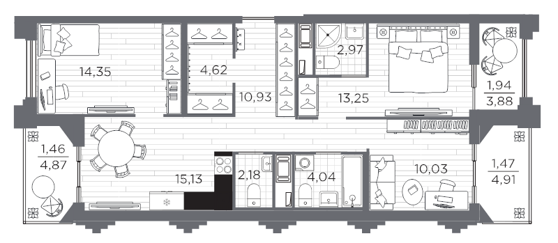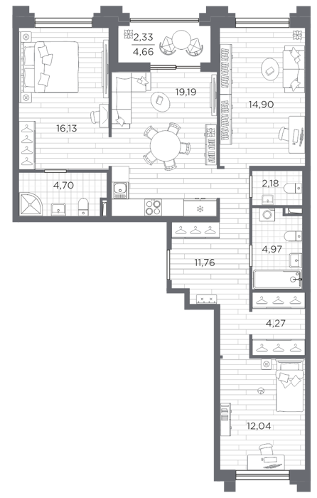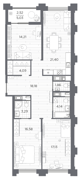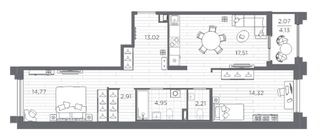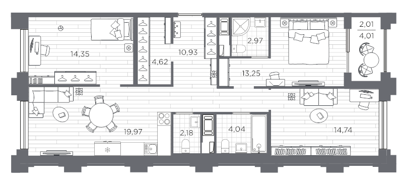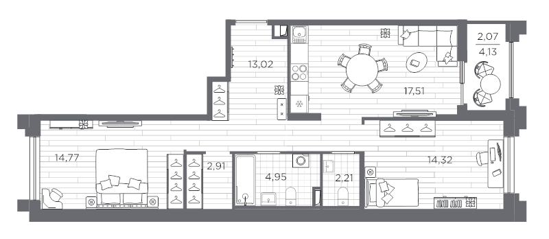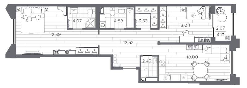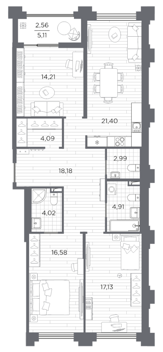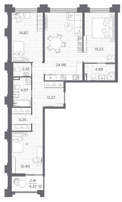 Всего в проекте — 907 квартир, включая евроформаты и просторные четырёхкомнатные решения. Высота потолков достигает 3,2 метра. Для жителей предусмотрен подземный паркинг на 667 машиномест.