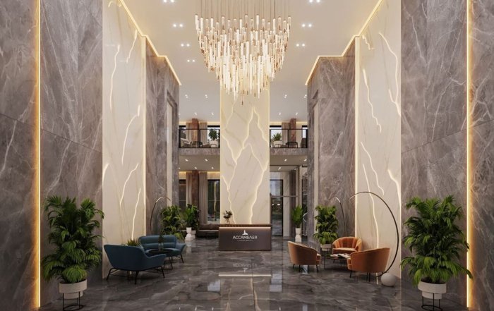 В гранд лобби площадью 220 кв.м на первом этаже обустроены мягкие гостевые зоны, ресепшн и интерьерные арт-объекты.