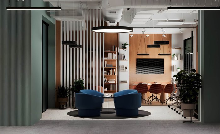 На втором антресольном этаже размещены зоны для отдыха, работы и проведения встреч.